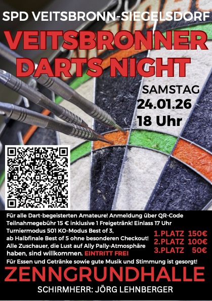 Nach der sehr erfolgreichen 1. Darts Night 2025 lädt die Veitsbronner SPD zur 2. Veitsbronner Darts Night am Samstag, den 24.01.26 in die Zenngrundhalle ein. Bis zu 128 dartbegeisterte Amateure werden an 14 Boards um die Preisgelder fighten. Die Anmeldung erfolgt über den QR-Code, das Startgeld von 12 Euro + 3 Euro (für ein Freigetränk) wird beim Einlass (ab 17 Uhr) gezahlt.